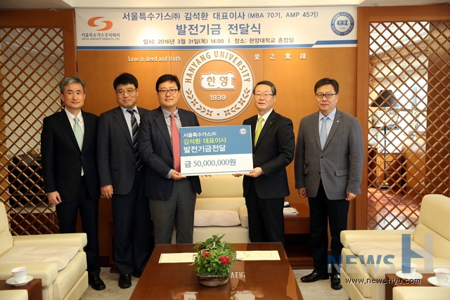 김석환 서울특수가스 대표이사의 AMP 발전기금 전달식이 31일 오후 2시 신본관 총장실에서 진행됐다. 이날 전달식에는 한양대 이영무 총장, 장석권 경영대학장, 정성훈 대외협력처장, 박동규 경영교육원 부원장 등이 참석했다.