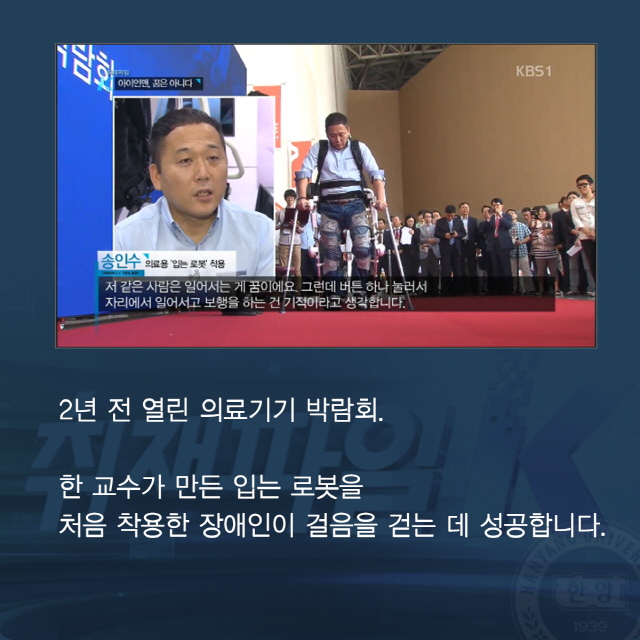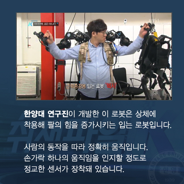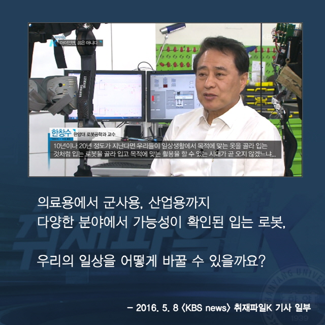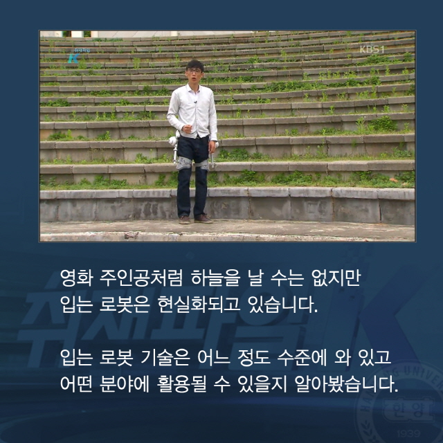 8일 KBS뉴스에서 집중 기획으로 다룬 '입는 로봇'. 이 뉴스에는 한양대 ERICA캠퍼스의 로봇공학과에서 개발한 입는 로봇들이 함께 소개되었습니다. 카드 뉴스로 어떤 내용인지 만나보시죠.