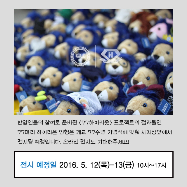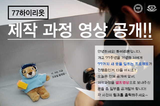 한양브랜드서포터즈 학생들이 개교 77주년을 기념해 진행하고 있는 프로젝트 '77하이리옷' 공개가 임박한 가운데, 제작 참가자들의 셀프 영상을 일부 공개했습니다. 하나 하나 개성넘치는 소중한 변화의 과정인 이 영상들은 유튜브를 통해 10개가 공개되었는데요. 아래 소개와 함께 골라 보시죠!