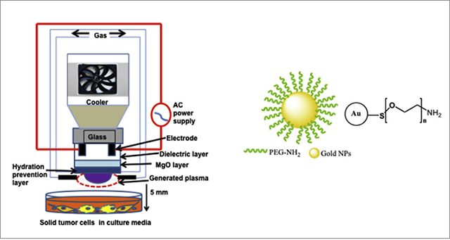 | ▲ 냉각된 저온 플라스마를 암 세포에 투사하면 정상 세포에 영향을 끼치지 않고 금 나노 입자의 반응을 유도할 수 있다. (출처 : 이수재 교수) | ||