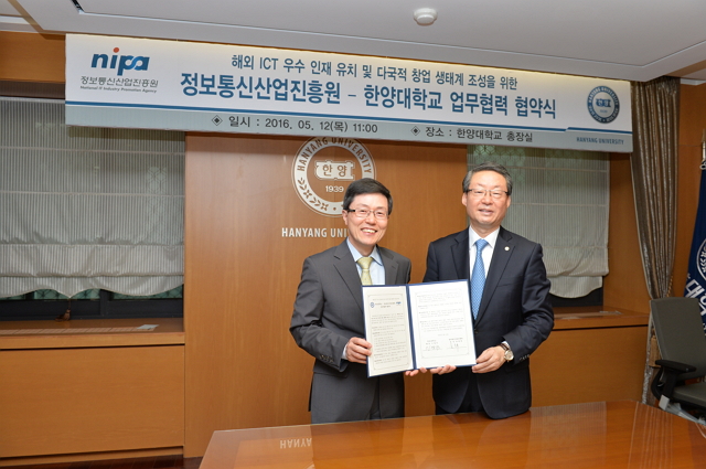 한양대는 정보통신산업진흥원과 5월 12일 서울시 성동구 교내 신본관에서 ‘해외 우수 인재 유치 및 다국적 창업 생태계 조성’을 위한 업무협약(MOU)을 체결했다.