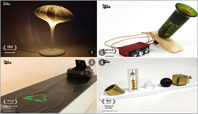 | ▲ '2016 업사이클링 3D 프린팅 디자인 어워드' 수상작은 모두 3D 프린터를 이용해 창의적인 아이디어를 실현한 작품들이었다. ① 대상작 'Mushroon Lamp' ② 최우수상작 'Re:stening' ③ 우수작 박주형(건축학과3) 씨의 '차량용 안전 삼각빔' ④ 특선작 '스테이셔노리' (출처 : 아이디어팩토리) | ||