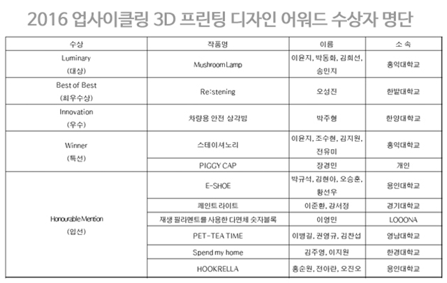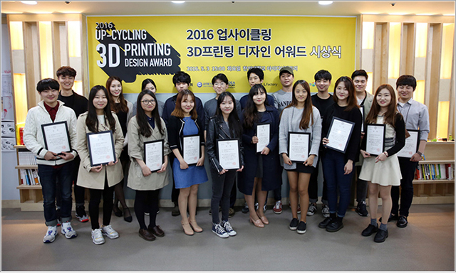 2016 업사이클링 3D 프린팅 디자인 어워드는 한양대 글로벌기업가센터 아이디어팩토리 주최, 산업통상자원부와 한국산업진흥기술원이 지원한 공모전이다. 공모주제는 ‘업사이클링과 리사이클링을 이용한 생활 속 디자인’이었다. 3D 프린팅을 이용해 기존의 도구에 디자인과 활용도를 더한 새로운 제품을 탄생시키는 것. 온라인 지원서 제출 후 현물 접수를 하도록 했다. 최종적으로 42개의 작품이 접수됐다. 생활용품부터 산업용품까지 용도가 다양했다.