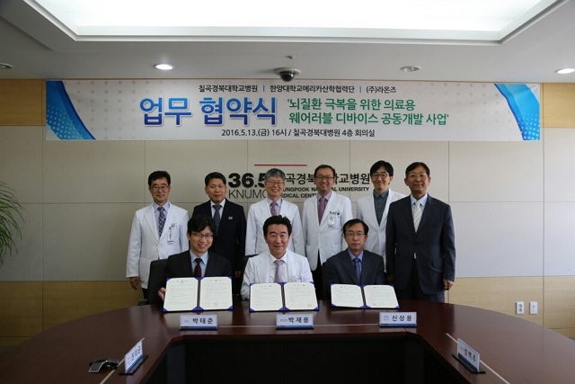 한양대 ERICA캠퍼스 로봇공학과 박태준 교수 연구팀이 칠곡경북대병원(병원장 박재용) 뇌신경센터 연구팀(이호원·강경훈·고판우 교수)과 5월 13일 바이오메디컬 장비기업인 ㈜라온즈(대표 신상용)와 공동으로 ‘노인성 뇌질환 진단 및 치료용 웨어러블 디바이스 개발’을 위한 업무협약을 체결했다고 31일 밝혔다. 또한 한양대 연구팀과 ㈜라온즈는 식품안전 등 생활환경 종합 안전진단을 위한 웨어러블 디바이스 개발을 공동으로 추진하기로 했다.