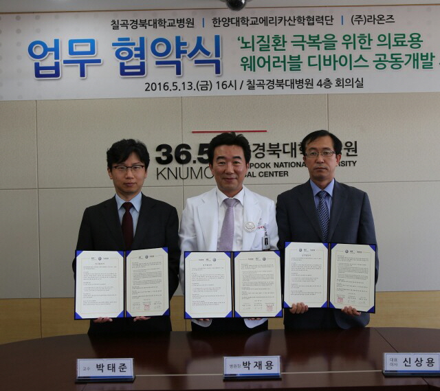 | ▲ 한양대는 로봇공학과 연구팀이 칠곡경북대병원 뇌신경센터 연구팀과 지난 13일 바이오메디컬 장비기업인 ㈜라온즈(대표 신상용)와 ‘노인성 뇌질환 진단 및 치료용 웨어러블 디바이스 개발’을 위한 업무협약을 체결했다고 밝혔다. 사진 왼쪽부터 박태준 한양대 로봇공학과 교수, 박재용 칠곡경북대병원장, 신상용 (주)라온즈 대표. | ||