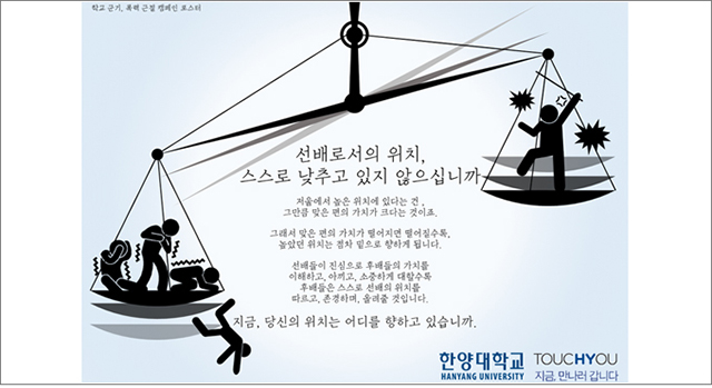 지난 13일 교육부는 ‘대학 내 건전한 집단활동 운영 대책’을 마련하고 각 대학에 학칙 개정을 요구할 계획이라고 밝혔다. 대학 차원의 예방책이 필요한 상황. ERICA캠퍼스 총학생회는 “사건사고 예방을 위해 이번 공모전과 같은 캠페인을 적극적으로 활용하고, 학생들의 입장을 이해하기 위해 개방된 소통 체계를 구축하겠다”고 했다. 대학은 ‘인생의 의미, 사회와 공동체의 참 뜻을 깨닫게 해주는 좋은 기관’이라는 송호근 교수(서울대)의 말처럼, 폭력과 군기가 없는 아름다운 문화를 조성해 대학의 순기능적인 모습을 실현하는 한양대학교가 되길 기대해본다.