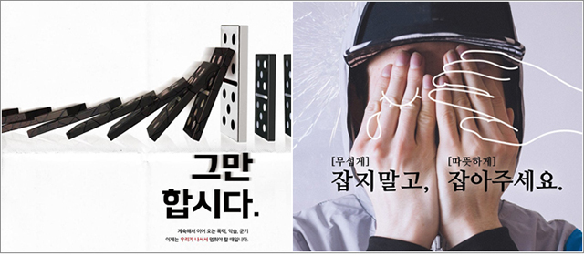 | ▲ 전달력 있는 내용으로 공동 3등에 오른 포스터 '그만합시다'(좌)와 '잡아주세요'(우) (출처 : ERICA 총학생회 공식 페이스북 페이지) | ||