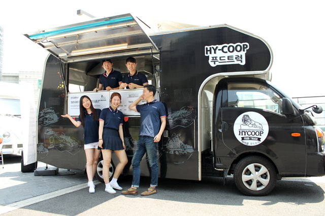 | ▲ HYCOOP 학생 조합원들이 지난 7일부터 상시 운영을 개시한 캠퍼스 푸드트럭 현장에서 기념 촬영을 하고 있다. | ||