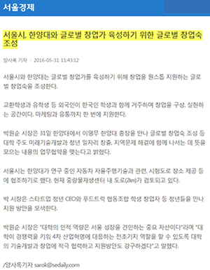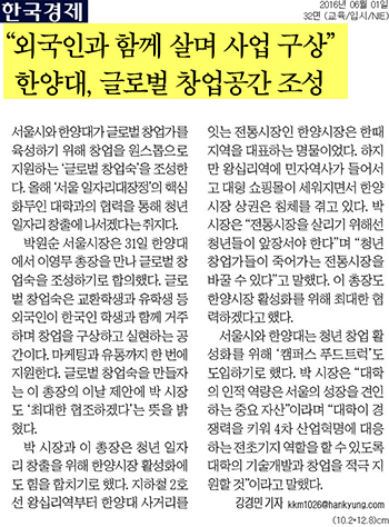 5월 31일과 6월 1일 <한국경제>, <서울경제>, <뉴스1>, <연합뉴스>에서는 한양대와 서울시가 업무협약을 맺고, 청년일자리 창출과 지역 활성화를 위해 힘을 모으기로 했다는 소식이 전해졌습니다. 박원순 서울시장은 31일 한양대에서 이영무 총장을 만나 글로벌 창업가를 육성하기 위해 창업을 원스톱으로 지원하는 글로벌 창업숙 조성, 청년 일자리 창출을 위한 한양시장 활성화에 힘을 합치기로 했습니다. 뿐만 아니라 청년 창업 활성화를 위해 '캠퍼스 푸드트럭'도 도입하기로 했는데요. 박 시장은 "대학의 인적 역량은 서울의 성장을 견인하는 중요 자산"이라며 "대학이 경쟁력을 키워 4차 산업혁명에 대응하는 전초기지 역할을 할 수 있도록 대학의 기술개발과 창업을 적극 지원할 것"이라고 말했습니다.