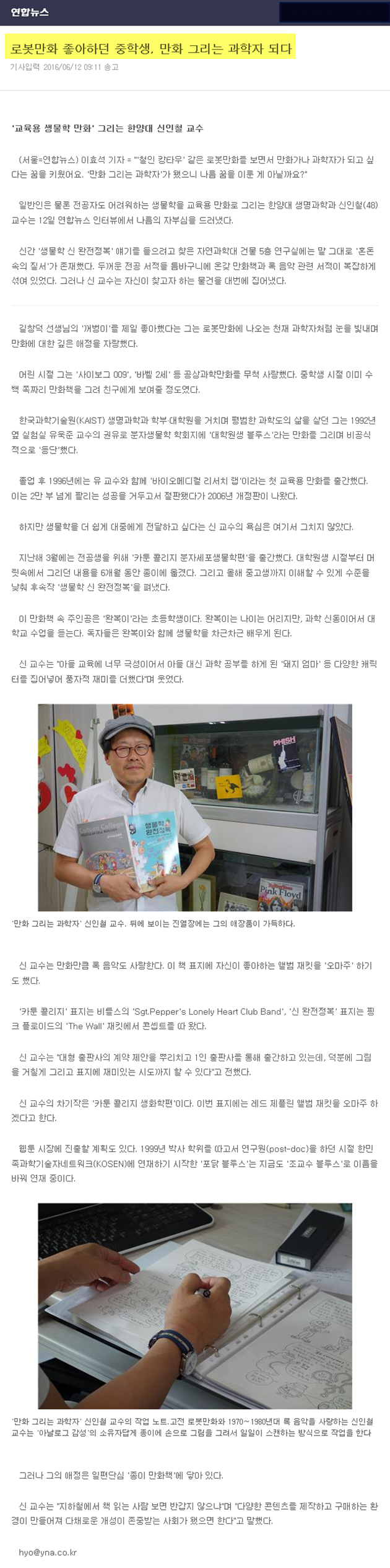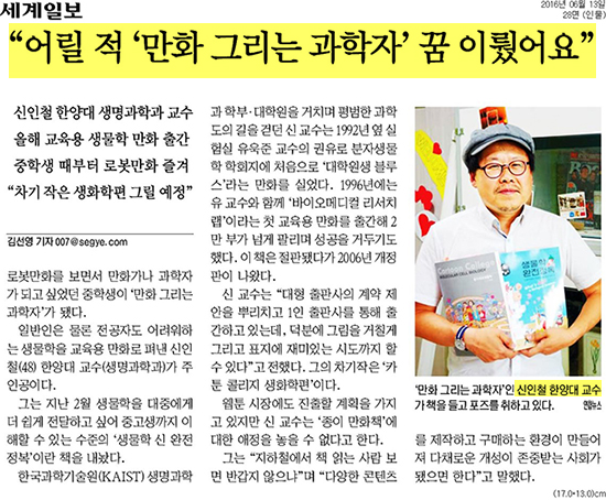 6월 12일과 13일 <연합뉴스>와 <세계일보>에서는 일반인은 물론 전공자도 어려워하는 생물학을 교육용 만화로 펴낸 신인철 생명과학과 교수의 인터뷰가 전해졌습니다. 학창시절 로봇만화를 보며 만화가나 과학자가 되고 싶었던 신 교수는 1992년 한 교수의 권유로 분자생물학 학회지에 처음으로 '대학원생 블루스'라는 만화를 실었는데요. 이를 계기로 그의 교육용 만화 그리기는 계속 되어 지난 2월에는 중고생까지 이해할 수 있는 수준의 '생물학 신 완전 정복'이란 책을 내놨습니다. 웹툰 시장에도 진출할 계획을 가지고 있지만 신 교수는 '종이 만화책'에 대한 애정을 놓을 수 없다고 하는데요. 신 교수는 "지하철에서 책 읽는 사람 보면 반갑지 않으냐"며 "다양한 콘텐츠를 제작하고 구매하는 환경이 만들어져 개성이 존중받는 사회가 됐으면 한다"고 말했습니다.