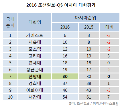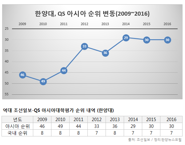 14일 조선일보가 영국의 대학평가 기관인 QS와 함께 '2015 조선일보-QS 아시아 대학평가' 결과를 발표했다. 한양대는 국내 7위, 아시아 30위로 지난 해와 동일하다.