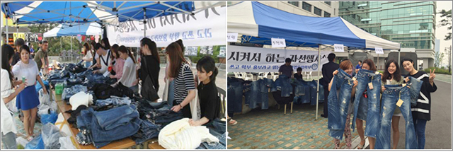 | ▲ 산업융합학부 학생들이 기부를 위해 축제에서 청바지를 팔고 있다. 임다혜 씨는 "놀이 위주의 축제가 아닌 기부를 통해 나누는 축제를 만들어 보고 싶었다"고 말했다. (출처 : 산업융합학부) | ||
