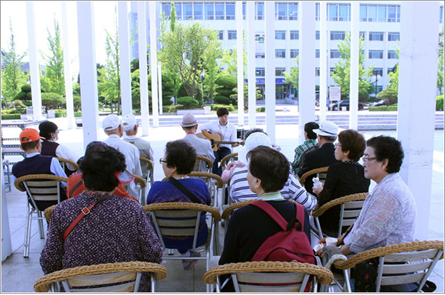 이진철 씨와 팀원들은 노년의 어르신들이 문화활동을 즐기지 못하는 현실을 봉사 활동을 계획했다. “문화라는 범주에서 동떨어져 계신 분들께 색다른 경험을 선물해 드려야겠다고 생각했어요.” 안산시 자원봉사센터를 통해 연락처를 받아 지역에 사는 스무 명의 어르신을 학교로 초대했다. 영화를 관람하고 ERICA캠퍼스 내 호수공원에서 직접 공연도 했다. 시간이 촉박해 장소나 공연 인원의 섭외가 수월하지 않았지만, 봉사가 끝나고 얻은 것이 많다고. “호수공원에서 아리랑을 연주하며 노래를 불렀어요. 어르신 중 한 분께서 한국전쟁 때를 생각하며 눈물을 훔치셨어요. 준비한 것은 저희지만 저희가 더 많은 것을 얻은 활동이었어요.”