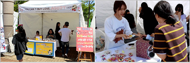 | ▲ 최환주(신문방송학과 3) 씨와 팀원들은 캡스톤 디자인 수업 프로젝트로 유기견을 위한 봉사, 기부활동을 계획했다. 지난달 14일, 15일 열린 '펫케어 페스티벌'에서 최환주 씨와 팀원들이 유기견을 위한 기부를 받고 있다. (출처: 최환주 씨) | ||