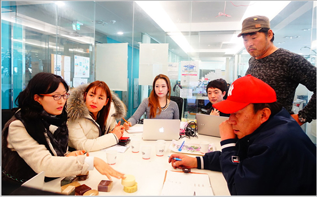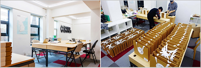 | ▲ 개방적인 분위기의 마이너 투 위너 사무실(좌). 판매된 이천 산수유차 세트를 포장하는 마이너 투 위너 직원들(우). (출처: 김하람 동문) | ||