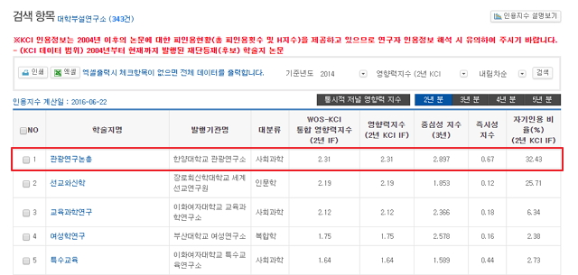 한양대 관광연구소가 발간하는 ‘관광연구논총’이 한국연구재단의 ‘KCI 2014년 인용지수 평가’에서 전국 대학부설연구소 343개 기관 중 전체 1위에 올랐다.