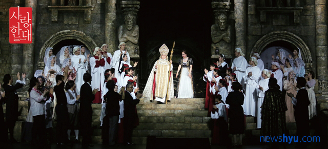 | 지난 6월 22일, 오전 내내 흐렸던 하늘이 결국 빗방울을 떨구기 시작했다. 이날은 한양대가 야심차게 준비한 야외 오페라 ‘토스카’ 공연이 열리는 날. 변덕스런 날씨에 마음을 졸인 것도 잠시. 해가 뉘엿뉘엿 넘어갈 즈음 하늘이 비를 멈추고 맑게 갠 얼굴을 드러냈다. 이날 오페라 ‘토스카’는 황홀하고 웅장하게 여름밤을 물들이며 야외 오페라의 백미를 선사했다. (글. 오인숙 / 사진. 하지권) |
