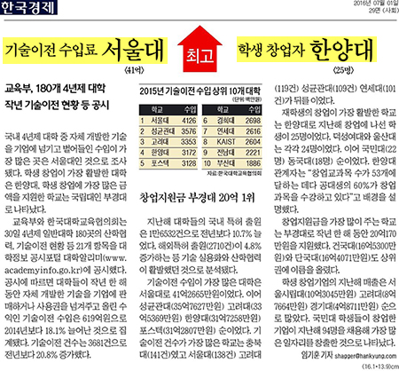 7월 1일 <한국경제>에서는 한양대가 작년 국내 4년제 대학 중 학생 창업이 가장 활발한 대학으로 선정됐다는 소식이 전해졌습니다. 교육부와 한국대학교육협의회는 4년제 일반대학 180곳의 산학협력, 기술이전 현황 등의 21개 항목을 공시했는데요. 공시에 따르면 작년 한양대의 기술이전 수입은 31억 7258만원으로 4위를 차지했고, 재학생 창업생은 지난해 25명으로 1위를 차지했습니다. 이에대해 한양대 관계자는 "창업교과목 수가 53개에 달하는 데다 공대생의 60%가 창업 과목을 수강하고 있다"고 말했습니다.