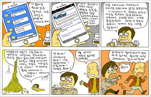 | ▲ 신인철 교수는 '카툰 콜리지' 외에도 과학도들의 애환을 담은 '조교수 블루스'를 연재 중이다. 사진은 '조교수 블루스'의 한 장면 (출처 : 신인철 교수) | ||