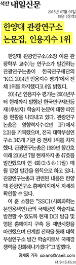 7월 7일 <내일신문>에서는 한양대 관광연구소가 발간하는 관광연구논총이 한국연구재단의 'KCI 2014년 인용지수 평가'에서 전체 1위를 차지했다는 내용이 전해졌습니다. 2014년 인용지수 평가는 2004년부터 현재까지 발행된 한국연구재당등재 학술지 논문에 대한 피인용 현황을 나타내고 있는데요. 관광연구 논총은 영향력지수(2년 1F)에서 2.31을 기록해 전국 대학부설연구소 343개 기관 중 전체 1위를 차지했습니다. 이에대해 이훈 소장은 "SSCI(사회과학논문인용색인)급의 국제공인 학술지로 발전할 수 있도록 현대 DOI 발급 및 영문 홈페이지 구축 등 제반사항을 마련했으며 단계별 전략을 통해 대학 부설연구소 발간 학술지로서 국제경쟁력을 강화해나가겠다"고 말했습니다.