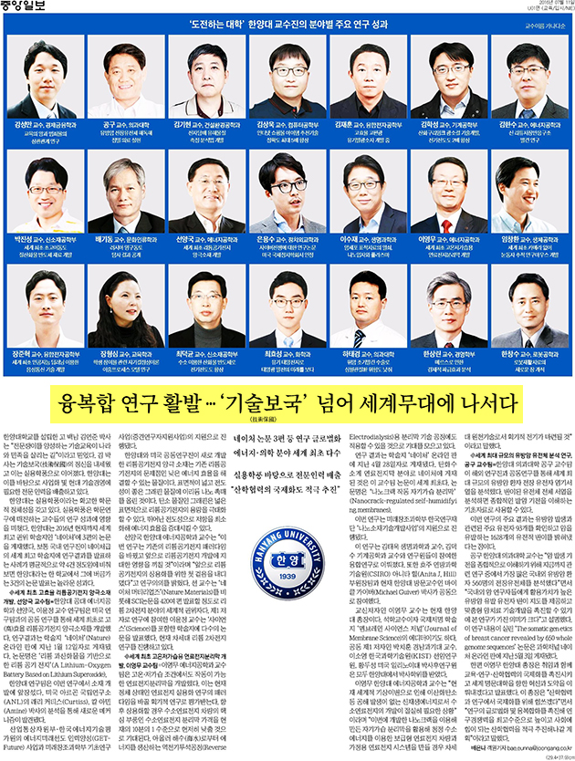 7월 11일 <중앙일보>에서는 한양대 특집 기사가 전해졌습니다. 한양대는 실용학풍이라는 확고한 학문적 정체성을 가지고 있습니다. 실용학풍은 학문연구에 매진하는 교수들의 연구 성과에 영향을 미쳤는데요. 한양대는 2016년 현재까지 세계 최고 권위 학술지인 '네이처'에 3편의 논문을 게재했습니다. 보통 국내 연구진이 네이처급의 세계 최고 학술지에 연구결과를 발표하는 사례가 평균적으로 약 4건 정도임에 비춰보면 한양대라는 한 학교에서 그에 버금가는 3건의 논문 발표는 놀라운 성과 입니다.