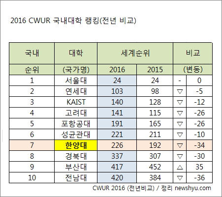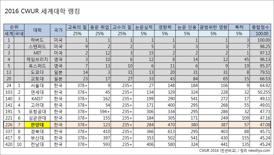2016년 세계대학랭킹센터(CWUR)의 대학 평가 순위가 7월 14일 발표됐다. 세계 1000개 대학에 평가가 이뤄졌으며 한양대는 226위에 랭크됐다. 국내 순위는 7위다.