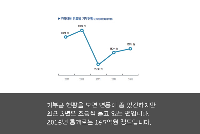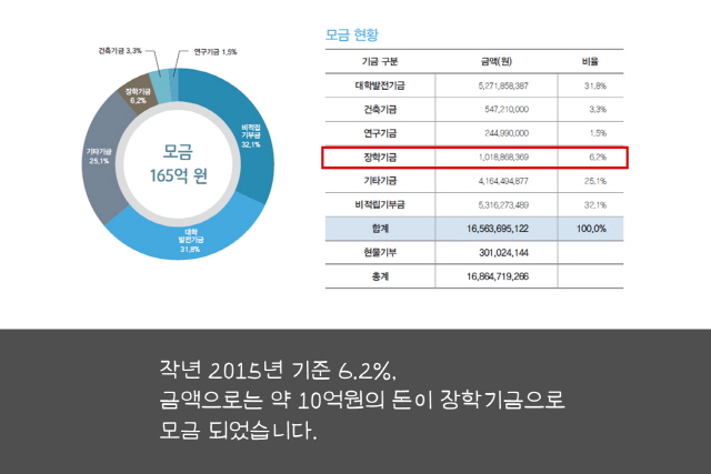 많은 동문 선배들이 후배들을 위한 장학금 조성 사업에 참여해주고 있다고 합니다. 하지만 아직 그 규모가 크지 않아서 더 많은 참여가 절실하다고 하는데요, 기부금 조성 현황이 어떤지 보시죠.