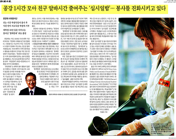 한양대는 건학 이념인 '사랑의 실천'을 실천하기 위해 많은 노력을 하고 있는데요. 한양대 학생들의 반짝이는 아이디어와 봉사 정신으로 시작된 '십시일밥'은 대학생 봉사활동 가운데 가장 혁신적인 프로젝트 중 하나로 손꼽히고 있습니다. '십시일밥'은 학생들이 공강 시간에 학생식당에서 봉사 활동을 하고, 그 대가로 식권을 받아 취약계층 학생들에게 이를 기부하는 활동입니다. 또한 한양대 학생들은 재학생 신분으로 가입비 1만원을 내면 누구나 가입해 이렇게 모여진 기금으로 급전이 필요한 조합원에게 돈을 빌려주는 소액 신용대출 공동체 '키다리 은행'을 운영하고 있는데요. 경제적으로 고통받는 대학생들의 고통을 함께 분담하는 공동체가 되는 것을 목표로 삼고 있습니다.