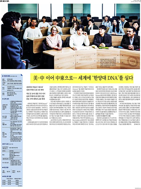 7월 13일 <조선일보>에서는 한양대 특집이 전해졌습니다. 한양대는 학생 창업 활성화를 위해 국내 대학 최초로 미국 뉴욕과 새너제이에 창업 기지를 설립했고, 중국 칭화대와 양해각서 체결 등을 통해 실질적 교류를 확대해 왔습니다. 여기에 더해 한양대는 지난해 '쿠웨이트센터'를 설립하고 학생 유치와 학술 교류 등 중동 진출의 교두보를 마련했습니다. 또한 한양대는 명품 강의를 인터넷에 탑재해 '강의의 글로벌화'도 지향하고 있는데요. 이를 위해 한양대는 서울대, 연세대, 고려대를 비롯해 국내 10개 대학과 함께 한국형 온라인 공개강좌 K-MOOC를 올해부터 본격적으로 시작했습니다. 또한 세계 4대 무크중 하나인 퓨처런과 강의 제공 협약을 맺음으로써 세계 의 모든 학생에게 한양대의 우수한 교수진과 좋은 강의를 제대로 보여주기 위해 노력하고 있습니다.