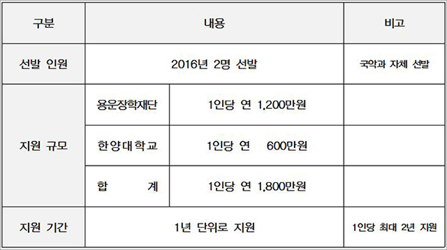 용운장학재단이 국악학 전문가 양성을 위해 음악대학 국악학과 박사후연구원에 연구비 지원을 약속했다. 이번 협약의 배경에는 국악을 통해 국학 발전을 실현한다는 조락교 용운장학재단 이사장의 의지가 있었다. "한양대의 국악 연구가 용운장학재단이 추구하는 ’국학 발전’에 기여할 것이라 생각해 지원을 결정했습니다.” 특히 연구책임자로 선정된 김영운 교수(국악과)의 연구 업적과 학회 활동이 우리대학에 대한 지원 결정에 큰 역할을 했다는 평가다. 용운장학재단은 "향토민요부터 궁중음악까지 실증에 바탕을 둔 폭넓은 연구에 매력을 느꼈다"고 말했다.