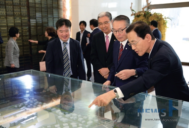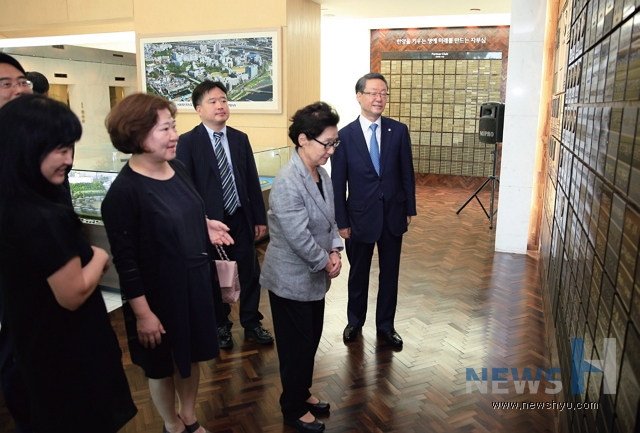 | ▲ 故 유세혁 박사의 가족과 한양대 관계자가 함께 신본관 1층을 둘러보고 있다. | ||