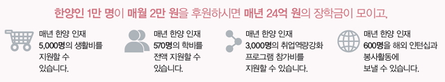 대한민국을 이끌어갈 한양 미래 인재 육성을 지원하기 위한 대중모금 캠페인 ‘Club 동행한대’ 가 시작되었습니다. ‘Club 동행한대’는 한 사람 한 사람의 소중한 정성을 모아 한양의 글로벌 인재를 만들어 갈 수 있도록 다각적인 지원을 펼쳐나갈 예정입니다.