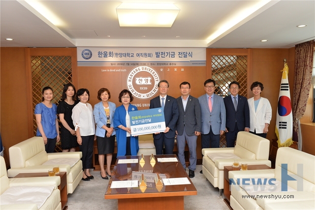 한양대 신본관 2층 총장실에서 7월 14일 오전 11시 30분 한양대 여직원 모임 ‘한울회’ 발전기금 전달식이 열렸다. 기부금은 6월 25일자로 1억 29만 원이 한울회 장학기금으로 기부됐다.