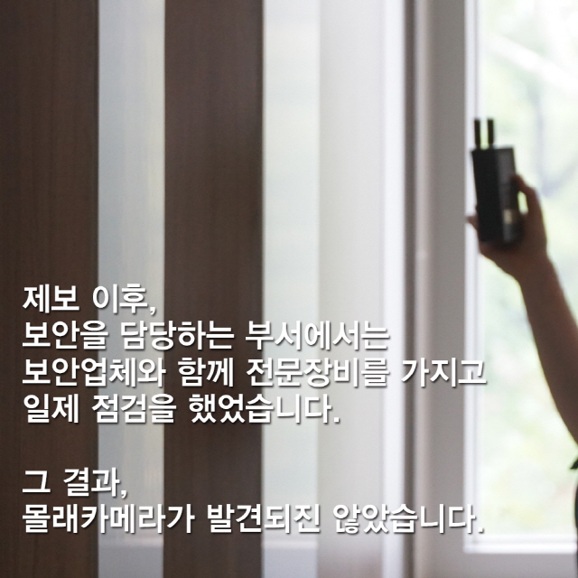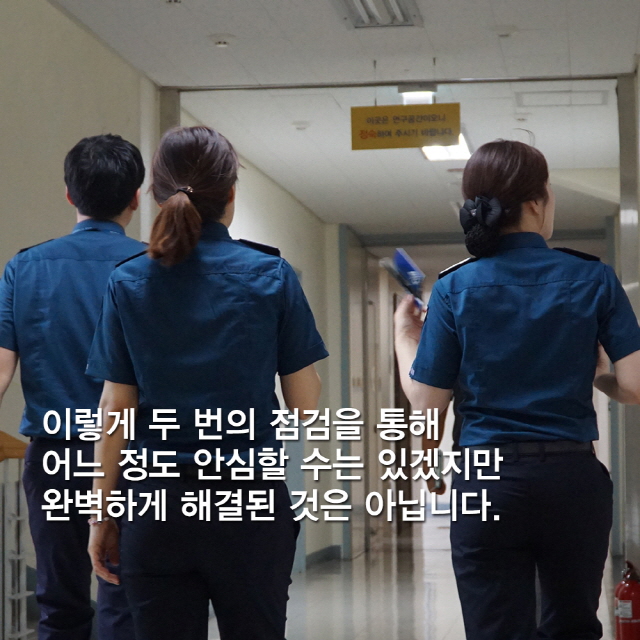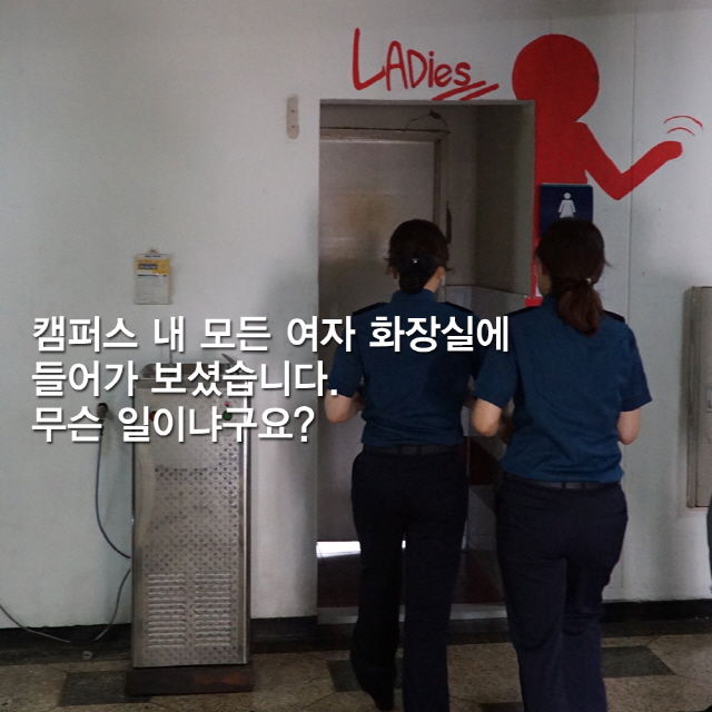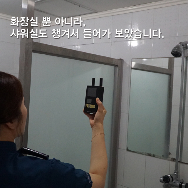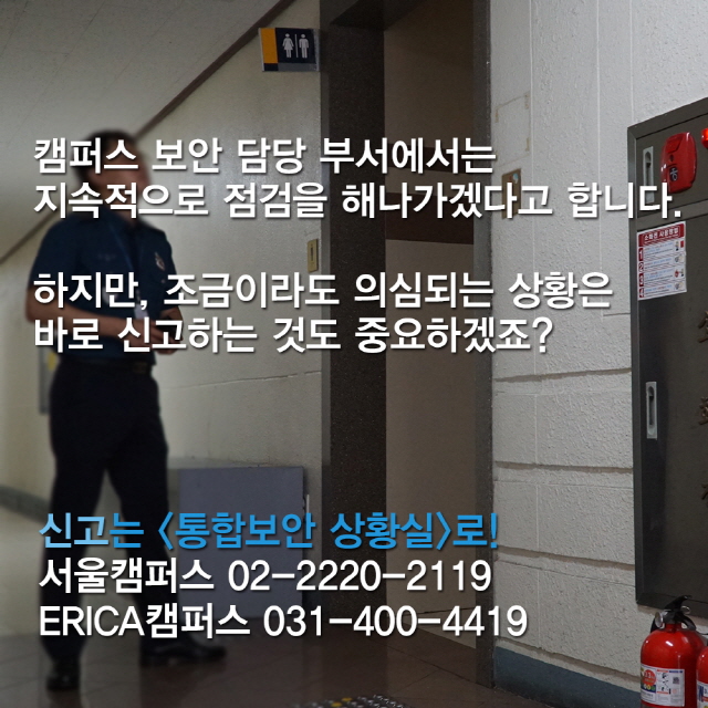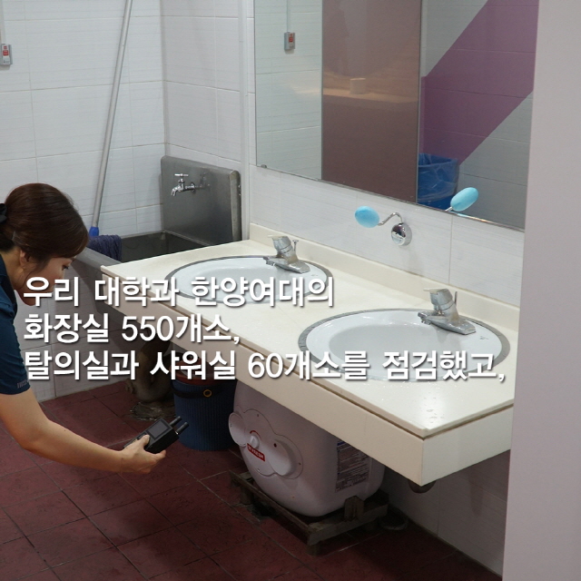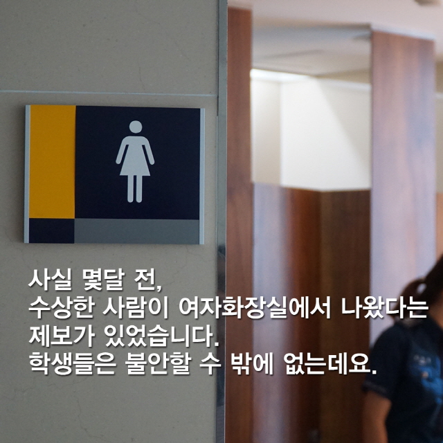 최근 성범죄 문제가 사회적으로 중요한 이슈가 되고 있죠? 캠퍼스에서도 대처 방안 마련에 고심하고 있는데요, 이렇게 직접 몰카탐지기가 동원되기도 했습니다. 다행히도 2번의 점검 결과 몰래카메라는 감지되지 않았습니다. 이후에도 지속적인 점검이 필요할 것 같습니다. 더불어 수상한 현장을 목격하게 된다면 바로 신고하는 협조도 필요하구요. 현장 소개해드립니다.