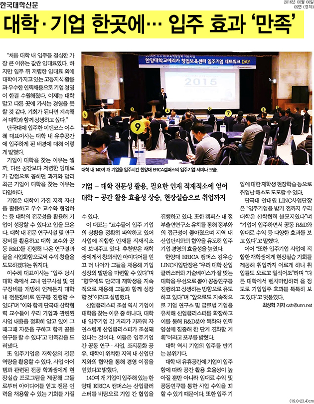 8월 8일 <한국대학신문>에서는 대학에 입주한 기업들에 대한 내용이 전해졌습니다. 많은 기업들이 대학 내 전문 연구시설 및 연구장비를 활용하고 대학 교수와 공동 R&D를 진행해 나온 연구결과물을 사업화함으로써 수입 창출을 도모하고 있는데요. 140여 개 기업이 입주해 있는 한양대 ERICA 캠퍼스는 산업클러스터를 바탕으로 기업 간 협업을 진행하고 있습니다. 또한 캠퍼스 내 정부출연연구소 유치를 통해 정부와의 접근성이 좋아졌으며 지역 내 산업단지와 협약을 유도해 입주기업 경영의 효율성을 높이고 있습니다. 이에대해 한양대 김우승 LINC사업단장은 "우리 대학 산업 클러스터와 기술베이스가 잘 맞는 대학을 우선으로 뽑아 공동연구를 진행하고 상생하는 방향으로 유도하고 있다"며 "앞으로도 지속적으로 기업 연그소 및 글로벌 기업을 유치해 산업클러스터를 확장하고 이를 통해 R&D분야 특화와 인력 양성에 집중해 한 단계 진화할 계획"이라고 말했습니다.
