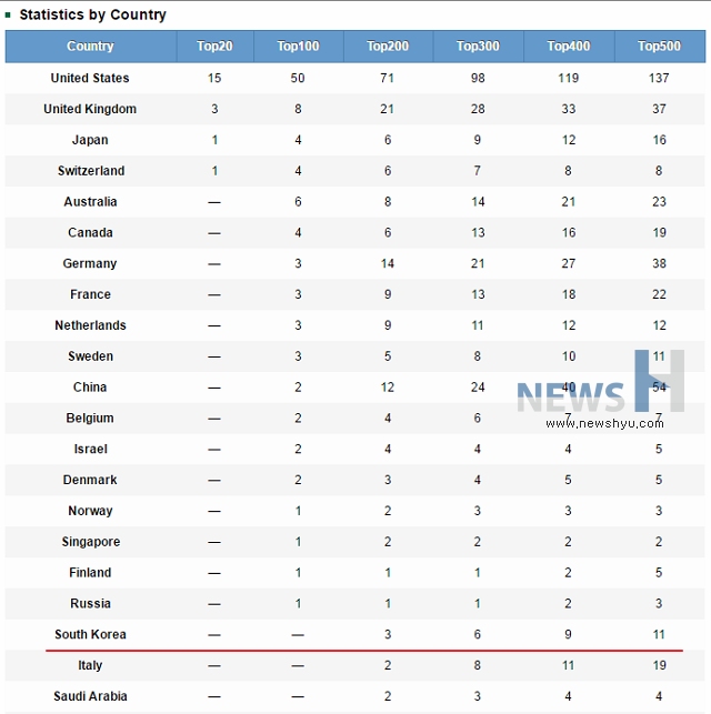 우선 세계 순위를 보면 TOP5 대학 목록은 같지만 순위 변동이 있었다. 전년도 3위였던 MIT 가 5위로 밀려난 것. 덕분에 4,5위 대학들은 한 계단씩 올라섰다. TOP500안에 국가별 대학수를 보면 미국이 137개로 가장 많다. TOP20에도 15개나 이름을 올렸고, TOP100에는 절반인 50개를 차지했다. TOP20에 미국 다음으로 많은 나라는 3개를 올린 영국이다. 하지만 TOP500 대학수로 보면 2위는 54개를 올린 중국이다. 한국은 TOP200안에 3개, TOP500안에는 11개를 올렸다. 전년보다 1개 감소했다.