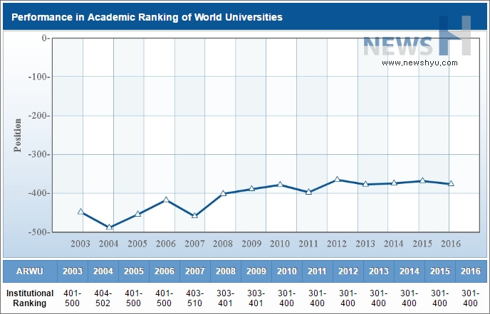 | ▲ 한양대학교 소개 내용 중 역대 순위 변화 그래프 (ARWU 공식홈페이지 캡처) | ||