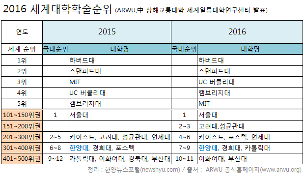 15일 중국 상해교통대학 세계일류대학연구센터가 ‘2016 세계대학 학술순위(ARWU; Academic Ranking of World Universities)’를 발표했다. 한양대는 작년과 동일한 300위권에 이름을 올렸다. 세계 1위는 미국의 하버드대가, 국내 1위는 서울대가 차지했다.