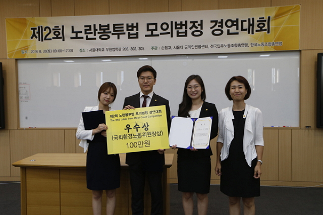 | ▲ 우수상(국회환경노동위원장상)을 받은 참가번호 2007번팀 한양대 법학전문대학원 김수현, 이승훈, 이해인 학생 (이미지출처: 오마이뉴스) | ||