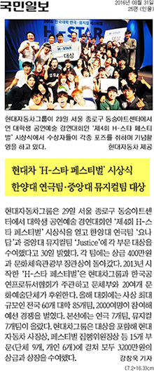 8월 31일 <한국경제>, <국민일보>, <헤럴드경제>에서는 한양대 연극팀이 현대자동차그룹이 주관하는 '제 4회 H스타 페스티벌'에서 연극 부문 대상을 수상했다는 내용이 전해졌습니다. 2013년 시작한 'H-스타 페스티벌'은 현대차그룹과 한국공연프로듀서협회가 주관하고 문체부와 20여개 문화 예술단체가 후원하는 전국 최대 규모의 대학 공연 예술 경영대회 인데요. 올해 대회에는 사상 최대 규모인 전국 60개 대학 85개팀, 2000여명이 참여해 경쟁을 벌였다고 합니다. 한양대의 연극 '요나답'은 연극부문에서 대상을 차지해 400만원의 상금과 문화체육관광부 장관상을 받았습니다. 각 부문의 우승팀은 내년 중국 상해시 대학생 연극제에서 공연하게 된다고 합니다.