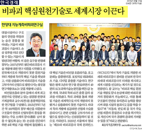 31일 <한국경제>에서는 한양대 지능계측비파괴연구실에 대한 소식이 전해졌습니다. 비파괴검사 기술은 대형시설이나 구조물의 안전을 위협하는 숨은 결함을 찾아내는 기술인데요. 정부는 손상 징후를 미리 진단 할 수 있는 기술을 개발하기 위해 2007년부터 연구 지원을 시작했습니다. 비선형초음파 분야 등에서 세계 최고 전문가로 인정받고 있는 장경영 한양대 기계공학부 교수를 총괄책임자로 한 연구팀은 정부 예산을 지원받아 구조물의 안전과 산업부품의 품질을 위협하는 주요 소재의 잠닉 손상을 진단하기 위한 4대 핵심 기술 개발에 돌입했습니다. 연구팀은 현재 3년차 연구를 완료하면서 49편의 SCI급 논문 게재, 국내외 특허 45건 출원 등의 성과를 이뤄냈습니다. 장 교수는 "비파괴 핵심 원천 기술 개발로 잠닉 손상에 대한 비파괴 평가의 정량화가 가능해지고, 이를 통해 구조물의 안전성 유지관리 능력을 향상시켜 대형 시설의 붕괴사고 등을 막을 수 있다"고 말했습니다.