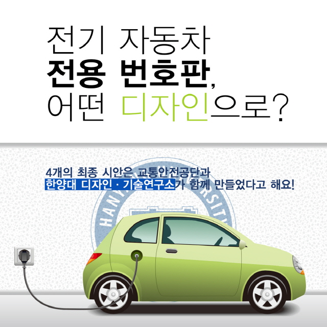 1일 국토교통부는 환경친화적 자동차 보급 활성화를 위해 추진하는 '전기자동차(수소차 포함) 전용 번호판 도입'과 관련하여 최종 시안 4개를 공개하고 선호도 조사를 실시한다고 밝혔다. 이 디자인 작업에는 한양대 디자인·기술연구소가 참여했다.