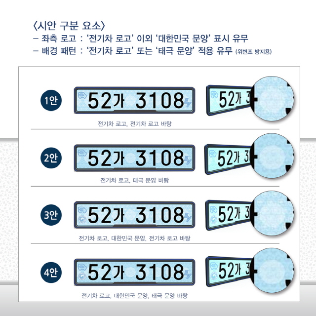 4개의 시안은 기존 번호판(흰색 초록색, 노란색 페인트 바탕에 검정 글씨)과 달리, 야간 시인성이 좋도록 반사지 판에 모두 연한 청색의 바탕이 적용되었다. 또한 위변조 방지를 위한 홀로그램을 삽입하였다. 국제적으로 통용되는 전기차 모양의 픽토그램과 EV(Electric Vehicle) 마크를 표시하는 등 기본 요소들을 모두 갖췄다. 4개 시안의 차이는 좌측 로고 자리에 전기차 모양 픽토그램 이외 국적표기 심볼(대한민국 문양)의 삽입 여부, 그리고 배경 패턴을 전기차 상징 픽토그램으로 할지, 태극문양 픽토그램으로 할지 여부에 따라 나뉘어서 구성한 것이다.