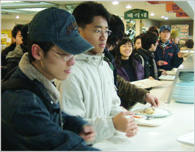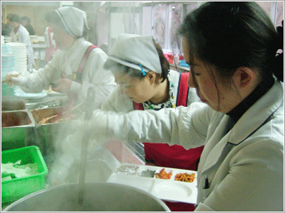 12시가 넘어 점심식사 시간이 되자 학생들이 본격적으로 몰려들기 시작한다. 어머니들의 “맛있게 드세요”라는 정감어린 목소리와 이른 새벽부터 준비한 정성 가득한 음식들이 학생들의 허기진 배를 채운다. 무한리필이 최고 장점인 이곳에서 남학생들이 자신의 식판을 들고 재차 배식대를 오가는 모습은 낯설지 않다. 배식도중 유 실장은 자식처럼 생각하고 음식을 만드시는 조리사분들에게 학생들이 좀 더 따뜻하고 공손했으면 하는 바람을 꺼내 놓는다. “불편한 점이 있으면 인터넷보다는 조리사나 영양사, 또는 건의함을 이용했으면 해요. 그러면 바로 오해도 풀리고 개선도 바로 되거든요” 이 날도 한 학생의 국이 좀 짜다는 지적에 아주머니들은 바로 간을 다시 맞췄다.