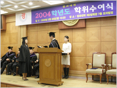 2004학년도 전기 법대 학위수여식이 지난 달 28일 제 2법학관 모의법정에서 열렸다. 27일에 치러진 1차 사법고시로 타 단과대학보다 늦은 졸업식을 거행한 법대는 이날 1백85명에게 법학사 학위를 수여했다. 평균평점 4.0 이상에게 주어지는 졸업우수상은 김석준 군을 비롯한 12명이 수상했으며, 사법시험 합격자에게 수여되는 공로패는 임동환 군을 포함한 8명에게 전달됐다.