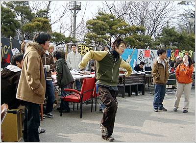 동아리 공개모집 첫 날. 한마당에 힘찬 북소리가 울려 퍼졌다. 풍물동아리 ‘신명’이 동아리 홍보차원에서 난타형식의 ‘승무북’ 북놀음을 선보였기 때문이다. 새내기들을 위해 방학 내내 공연 연습을 했다는 이 동아리 회원들은 새로운 형식의 풍물놀이로 신입생들의 감탄사를 자아내게 했기에 충분했다. 이 동아리의 회장 장은석(건축대·건축 3) 군은 “무엇보다 우리가 이렇게 ‘북을 치고 있는 것 자체가 즐겁다’라는 것을 보여주고 싶었다”며 “때문에 추임새도 평소보다 크게 하고, 우리의 표정 자체에서 흥을 느끼게 하기 위해 노력했다”고 전했다. 또한 댄스 동아리 ‘알스아망디’는 회원들이 시시때때로 수준급의 깜짝 댄스공연을 선보여 새내기들의 눈과 귀를 즐겁게 했다.