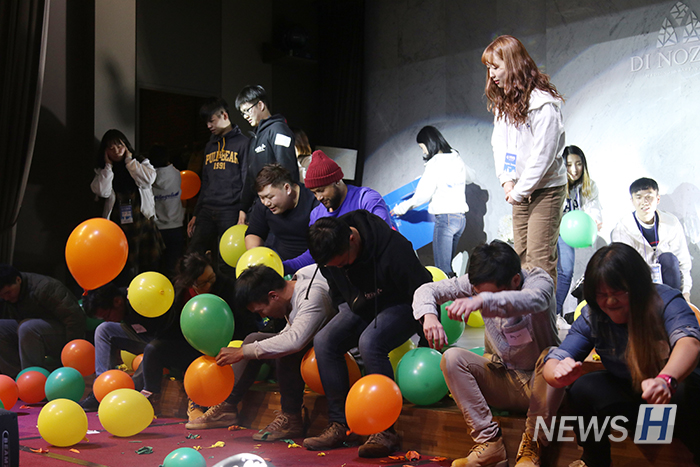 Beginning with the welcoming words from the OIA’s chief manager Lee Eun-ji, cheerful dance performances by HYU’s dance team and beautiful songs sung by Park Min-ji (Applied Music, 1) followed. With the lively hosting from the two emcees, Emile (Division of International Studies, 4) and Park Ji-young of the OIA, the party began. Main activities consisted of a quiz on HYU and Korea, balloon games, a dance battle, limbo, and learning K-pop songs. Two students from ‘Wingels’ also performed magic shows and EDM yoga to entertain their international friends.
