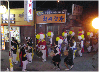 지난 4일 오후 6시 애지문에서는 애국한양문학예술학생연합(이하 애문연)의 주최로 ‘2005 애국한양 지신밟기 행사’가 진행됐다. 사방지신밟기로 시작된 이번 지신밟기는 ‘우리 것은 우리가 지키자’는 주제로 독도, 차별, 함께 하는 세상 등을 외치며 굿판을 시작했다. 풍악을 울리며 정문으로 장소를 옮긴 풍물패는 정문 앞에서 당산굿을 벌리며 분위기를 높여갔다. 당산굿은 마을 입구에서 마을을 지켜준다는 당산나무에게 지신밟기를 본격적으로 하기에 앞서 문안 인사를 드리는 굿. 풍물패는 한양 가족들의 건강과 복을 기원하며 굿판을 벌렸다.