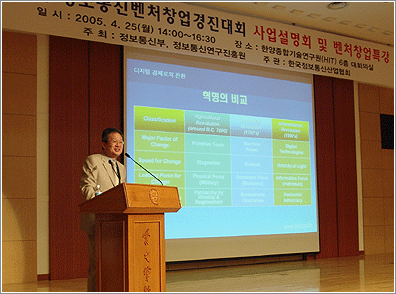 창의적인 아이디어와 도전정신으로 무장한 예비 창업인들의 각축장 ‘제 7회 정보통신 벤처창업 경진대회 설명회 및 벤처 특강’이 본교에서 개최됐다. 지난 26일 정보통신부와 한국정보통신산업협회 공동주관으로 한양종합기술원(HIT) 대회의실에서 개최된 이 행사에는 IT관련 벤처 창업에 관심이 있는 본교 학생들뿐만 아니라 서울지역 대학생, 예비 창업자 일반인, 기업체 직원 등 1백 30여 명이 참석한 가운데 진행됐다.