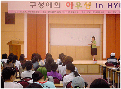 지난 7일 저녁 5시 한양종합기술연구동에서 열린 구 씨의 강연 ‘구성애의 아우성 in HYU'는 청중들이 성에 관해 궁금한 점을 사전에 익명으로 상자에 넣어 질문하고 구성애 씨가 이에 답하는 방식으로 진행됐다. 이날 나왔던 질문은 ‘혼전순결을 지켜야 하는가’, ‘남자친구의 요구에 응해야 하는가’ 등 대부분 여학생의 질문이었다. 구 씨는 이러한 질문에 “순결은 성행위의 경험 여부에 따라 판단되는 것이 아니라 배우자에 대한 믿음의 여부다”라고 강조하며 “‘성에너지’는 숨길 필요가 전혀 없는 것으로 개개인이 처한 입장에 따라 판단하면 되는 것”이라고 말했다.